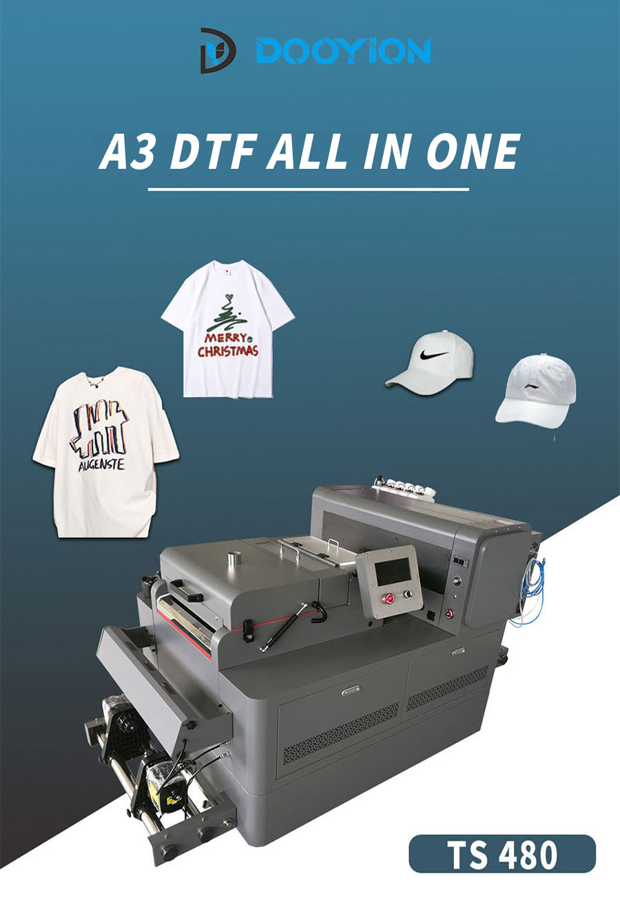 This Dtf printer TS480 including printer, powder shaker and film drying oven, they all install in one machine, which is economical and convenient DTF.