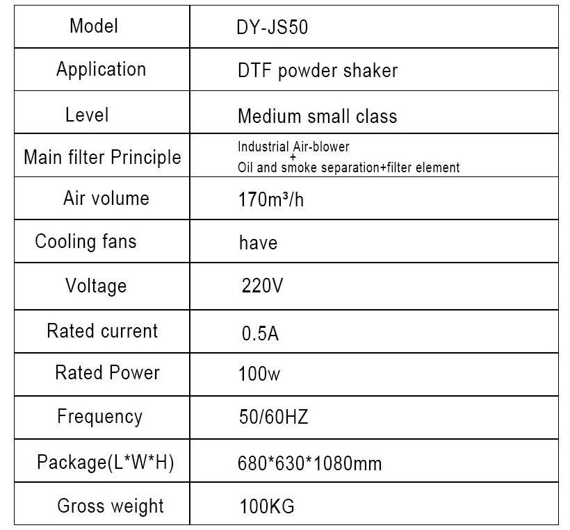 DY-JS50 medium-small-sized filter is typically applied to A3 size DTF pet film printer, i3200 or 4720 nozzle. At the same time, if you are a 60cm white ink film printer and the speed is not too fast, you can also use it. Its internal dtf oil fume filter chamber will be larger, and the filtering effect will be better than DY-JS30.Usually this model is a better choice if budget possible.